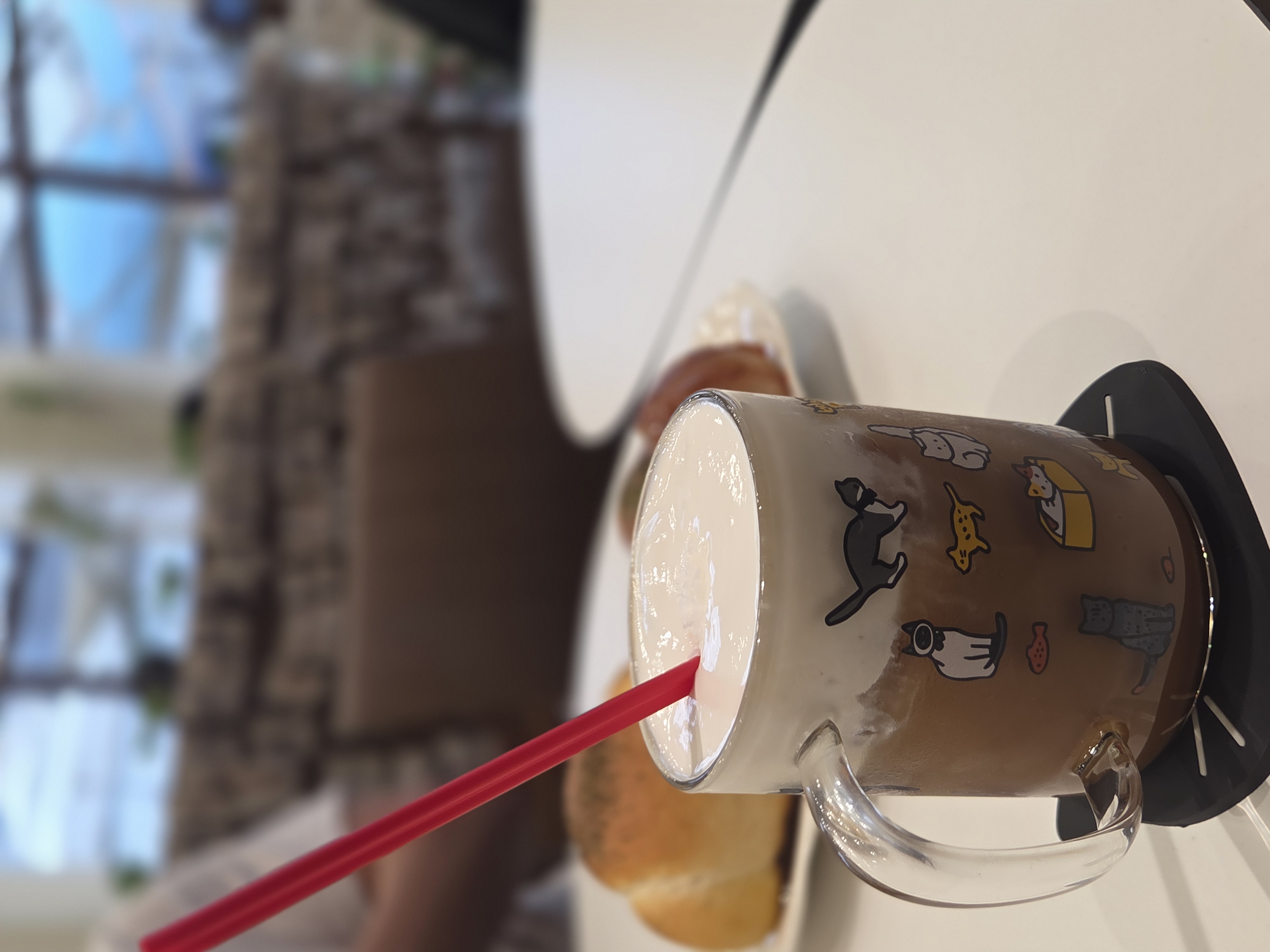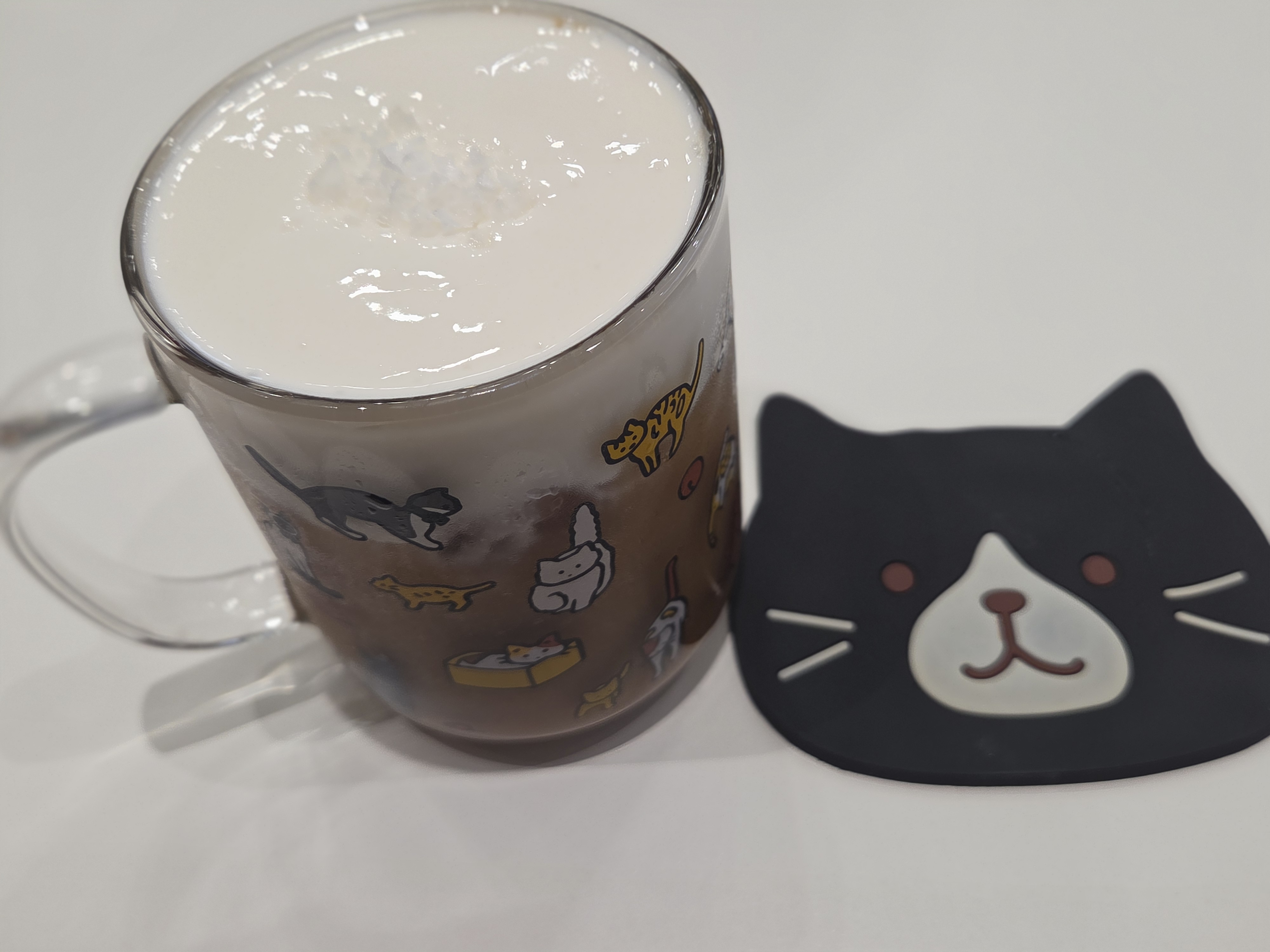 냥이 컵과 코스터: 제가 주문한 아이스 라떼가 담긴 컵에는 귀여운 고양이 일러스트가 가득했고, 그 밑에는 턱시도 고양이 모양의 실리콘 코스터가 깔려 있었어요! 🐈⬛ 소품 하나하나에서 느껴지는 따뜻하고 사랑스러운 감성이 정말 좋았습니다.