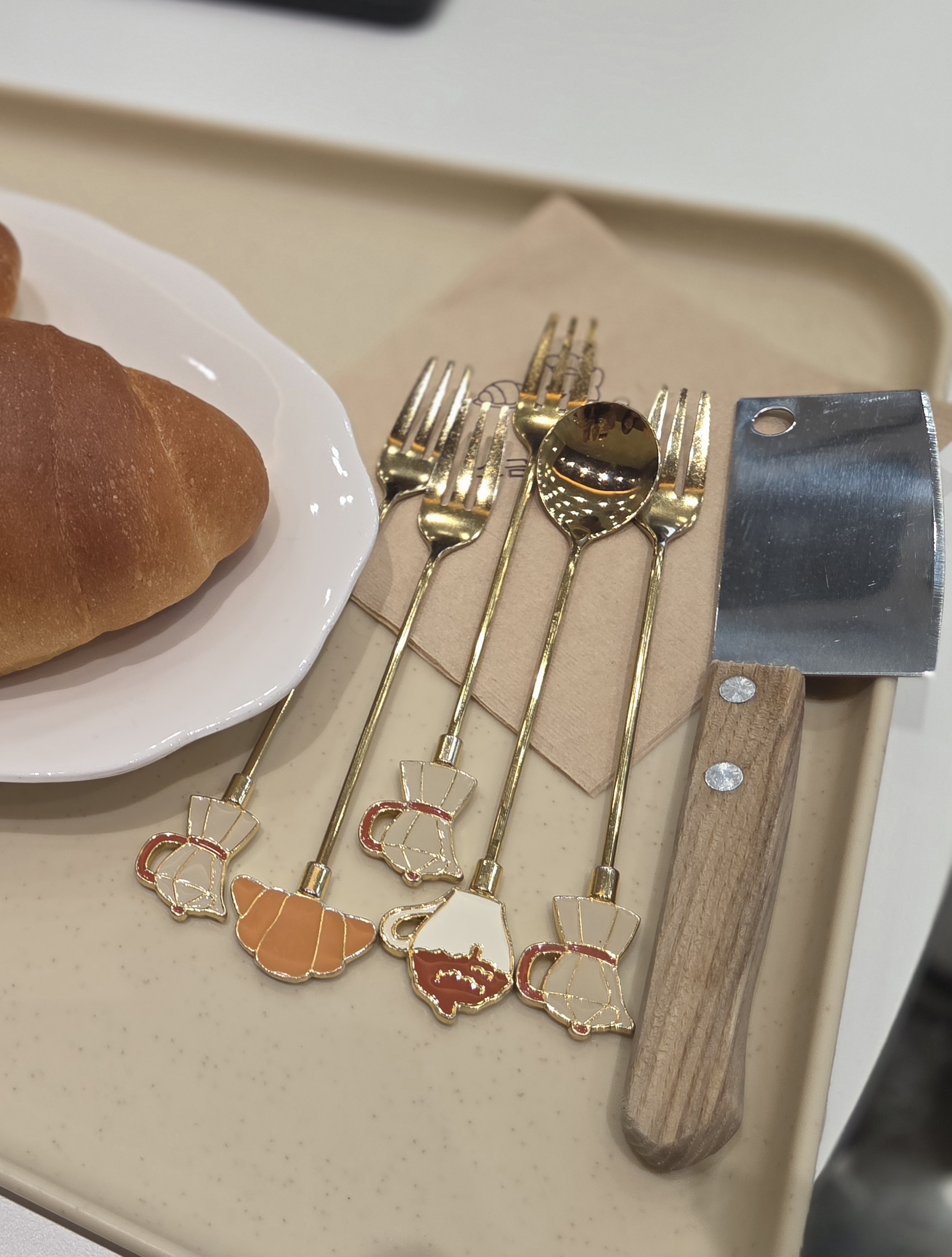 귀여운 커트러리: 소금빵을 담은 트레이 옆에 놓인 골드 포크와 스푼, 그리고 미니 식칼 좀 보세요! 🥺 커피잔, 주전자 모양의 에나멜 참이 달려있어 정말 사랑스러웠어요. 디저트를 먹는 즐거움을 더해주는 포인트였죠!