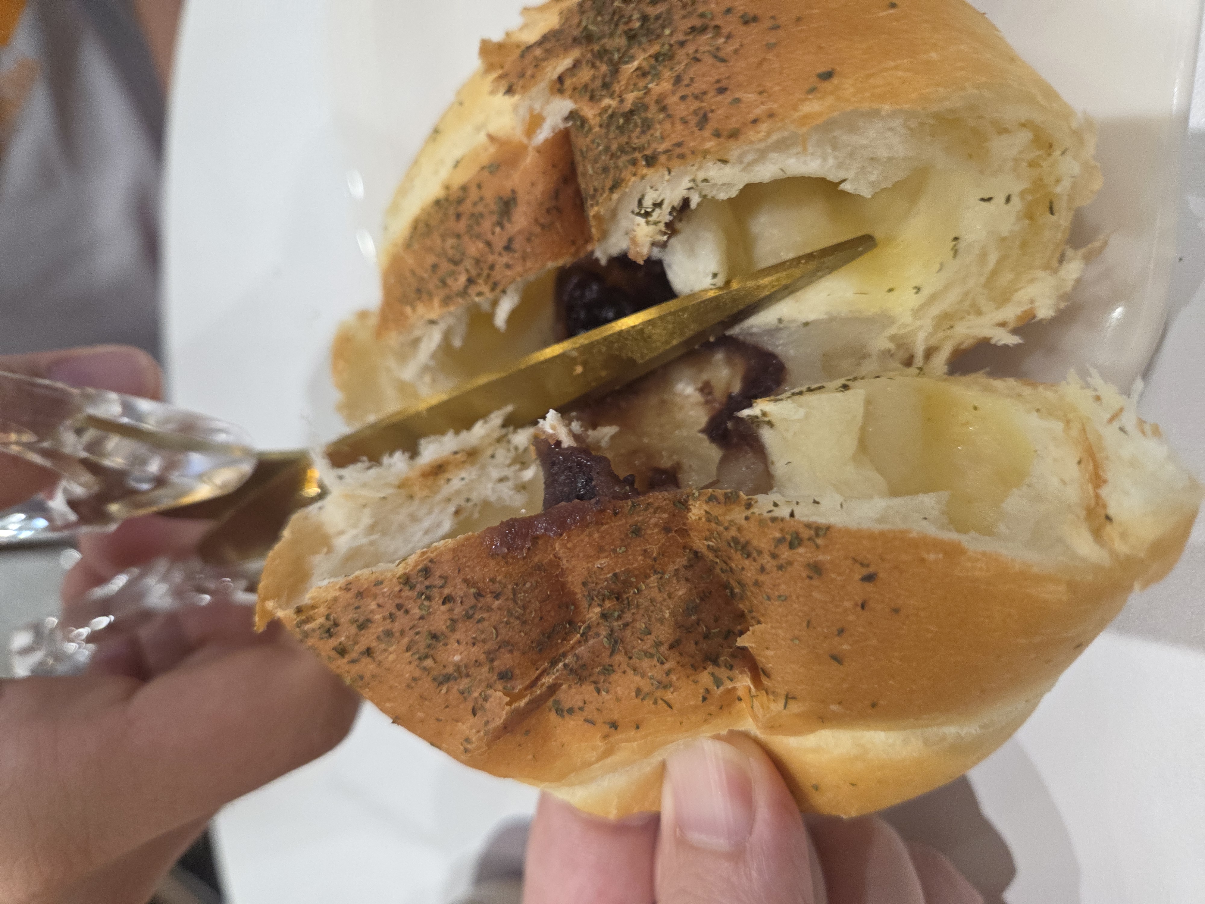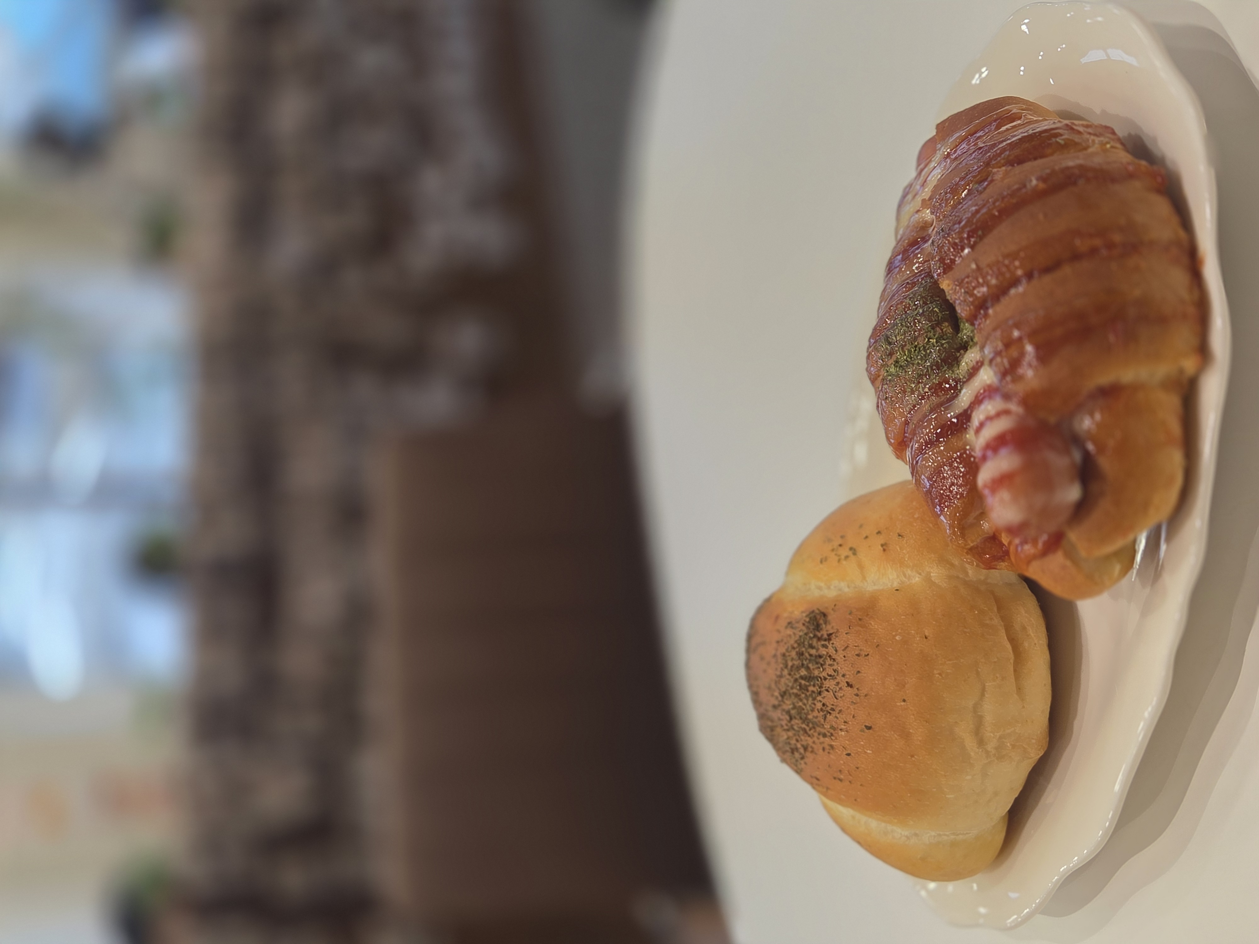 소세지와 모찌소금빵: 소세지와 소스가 올라간 빵과 담백한 소금빵을 함께 즐겼는데, 빵 자체가 맛있으니 어떤 토핑이 올라가도 환상적이었어요. 모찌 소금빵은 먹다보니 찌와 소금빵이 잘 어우러져 쫄깃쫄깃한 식감이 매력적이였어요.