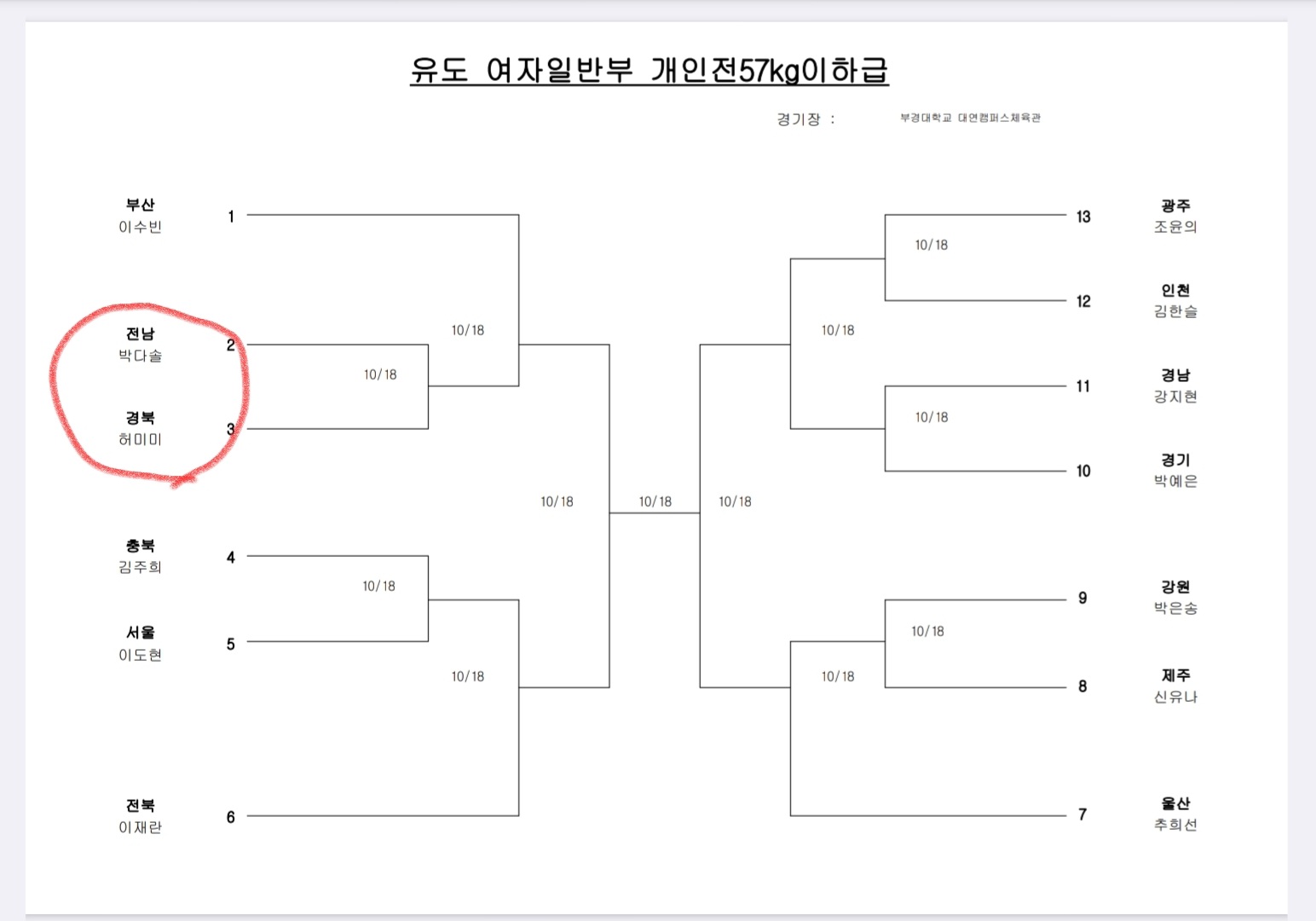 첨부된 대진표를 보시면 가장 눈길을 끄는 매치업이 있습니다. 바로 여자 일반부 개인전 -57kg급 1회전입니다.