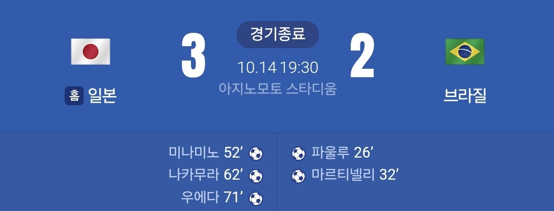 한국이 브라질에 대패했을 때(0-5), 일본은 브라질을 상대로 3-2 역전승을 거두는 역사적인 결과를 만들어냈습니다.