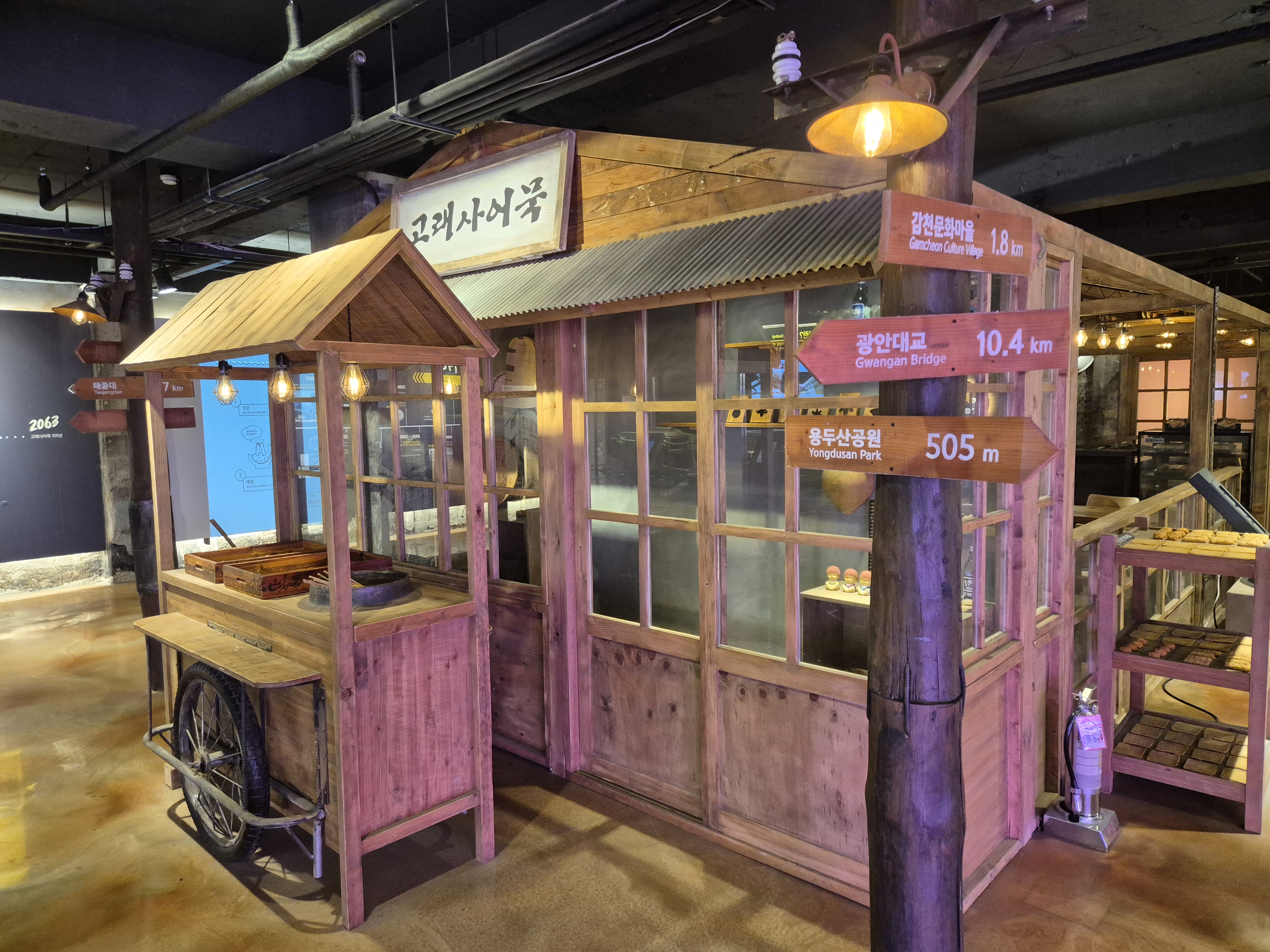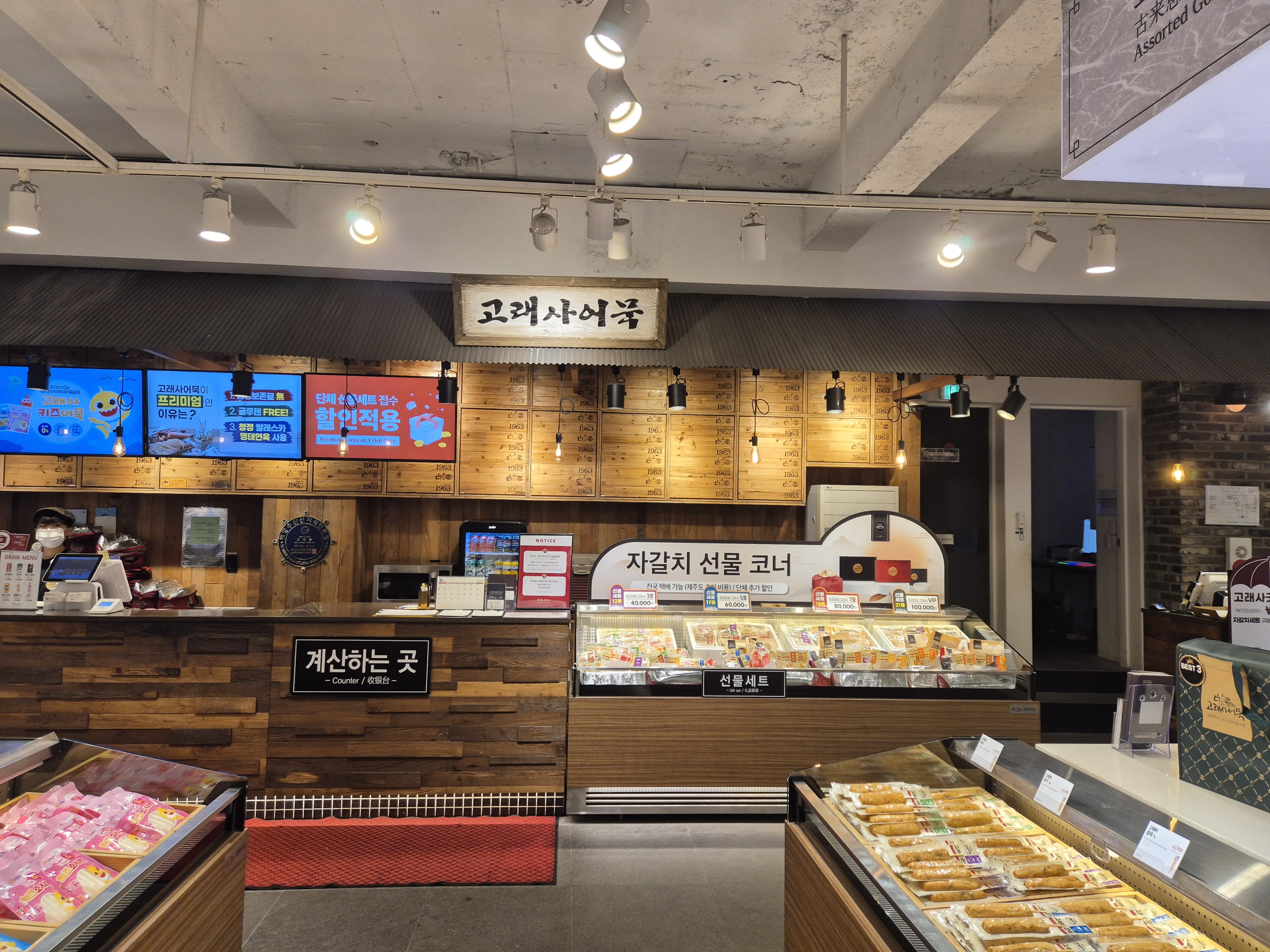 고래사어묵 매장의 인테리어도 정말 인상 깊었습니다. 마치 옛날 가게를 재현해 놓은 듯한 나무 구조물과 간판이 레트로한 느낌을 주면서 정겹고 따뜻한 분위기를 연출하더라고요. 단순한 판매점을 넘어 하나의 볼거리를 제공하는 듯했습니다.