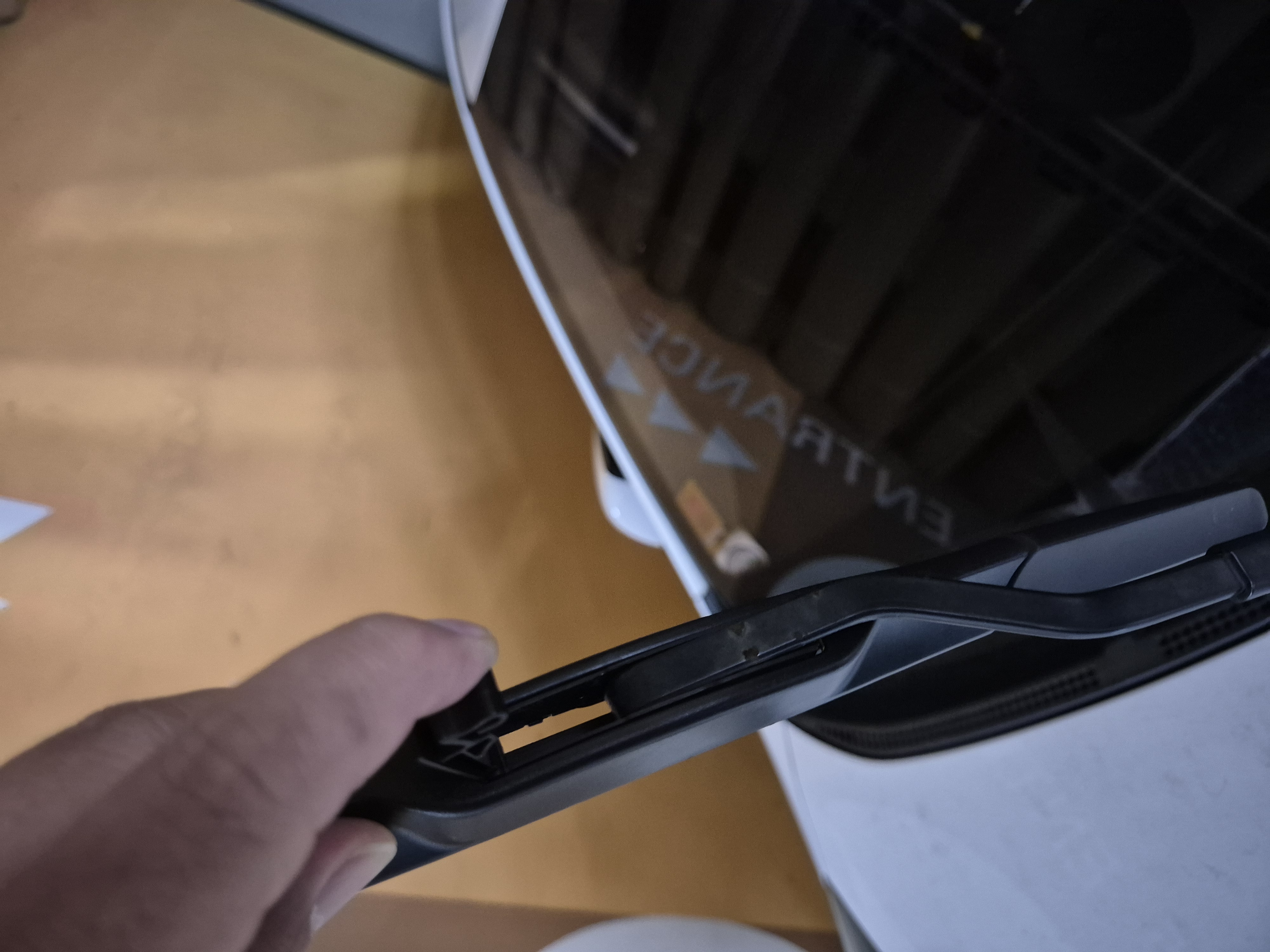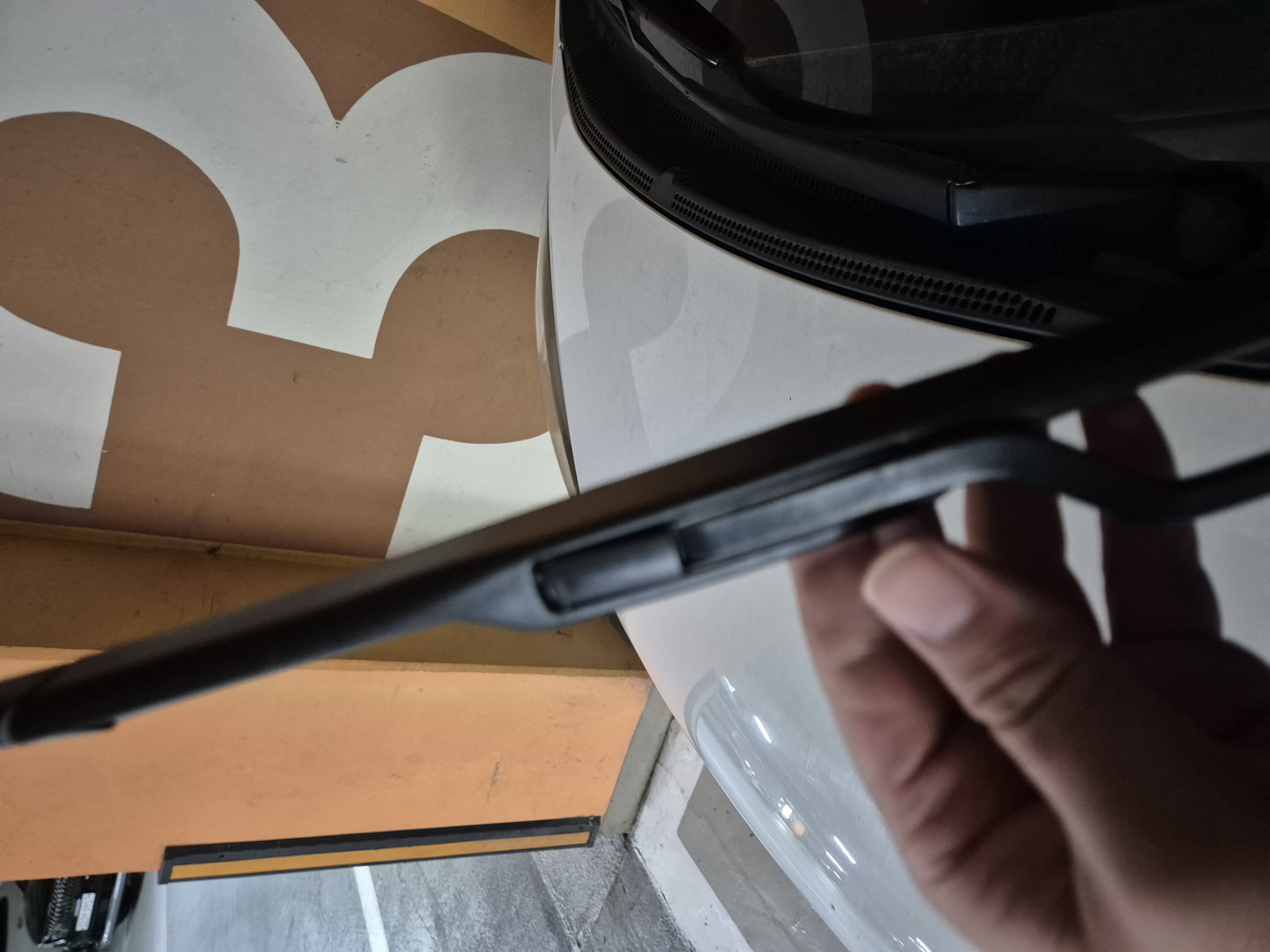 새 와이퍼 블레이드의 연결 부위를 와이퍼 암의 갈고리에 끼워 넣습니다.