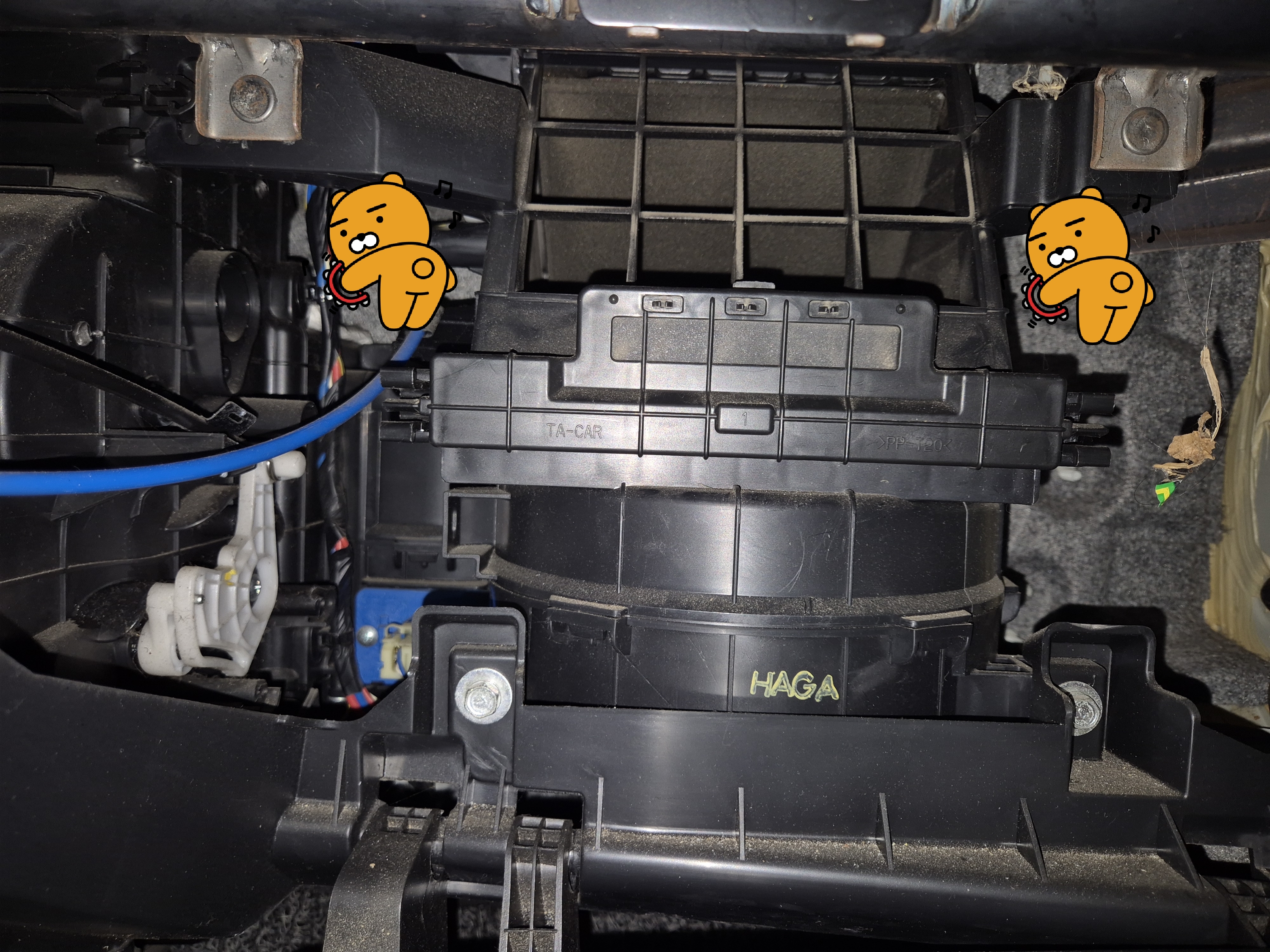 고정 핀이 제거되면 글로브 박스가 아래로 젖혀지면서 블로워 모터와 필터 케이스가 보입니다.