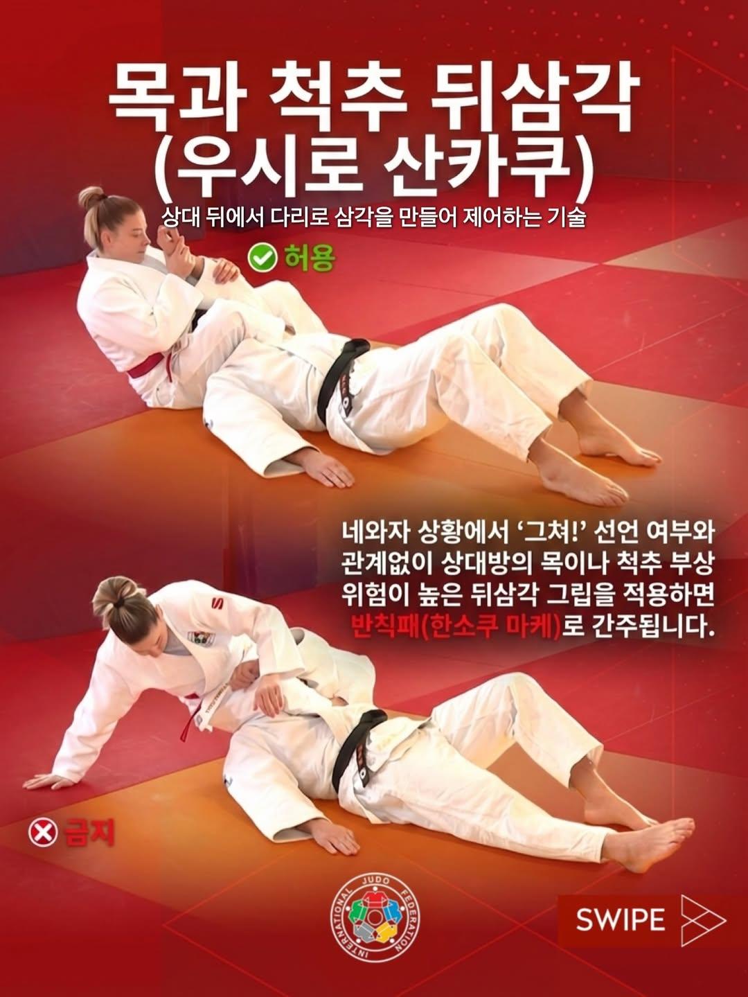 반칙패(Hansoku-make): 네와자 상황에서 '그쳐!' 선언 여부와 관계없이, 상대방의 목이나 척추 부상 위험이 높은 뒤삼각 그립을 적용하면 즉시 반칙패 처리가 됩니다. 선수들의 안전을 위한 강력한 조치입니다.