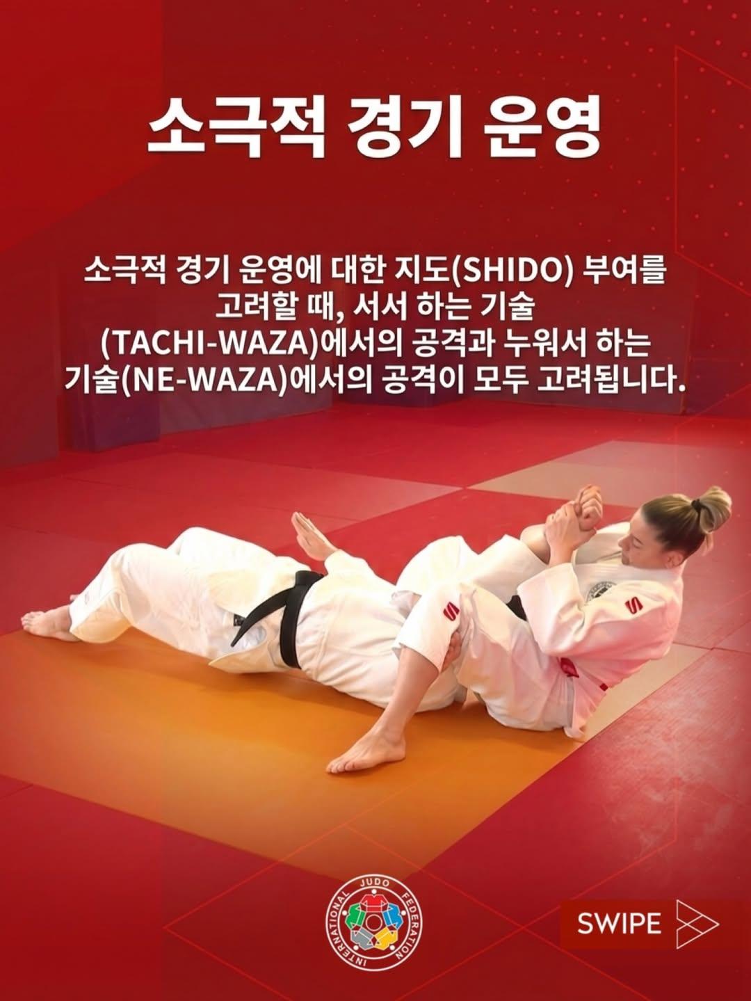 지도를 부여할 때의 고려 사항이 넓어졌습니다. 이전에는 서서 하는 기술(타치와자) 위주로 보았다면, 이제는 서서 하는 기술과 누워서 하는 기술(네와자)에서의 공격성을 모두 종합적으로 고려하여 소극적인 선수에게 지도를 부여합니다.
