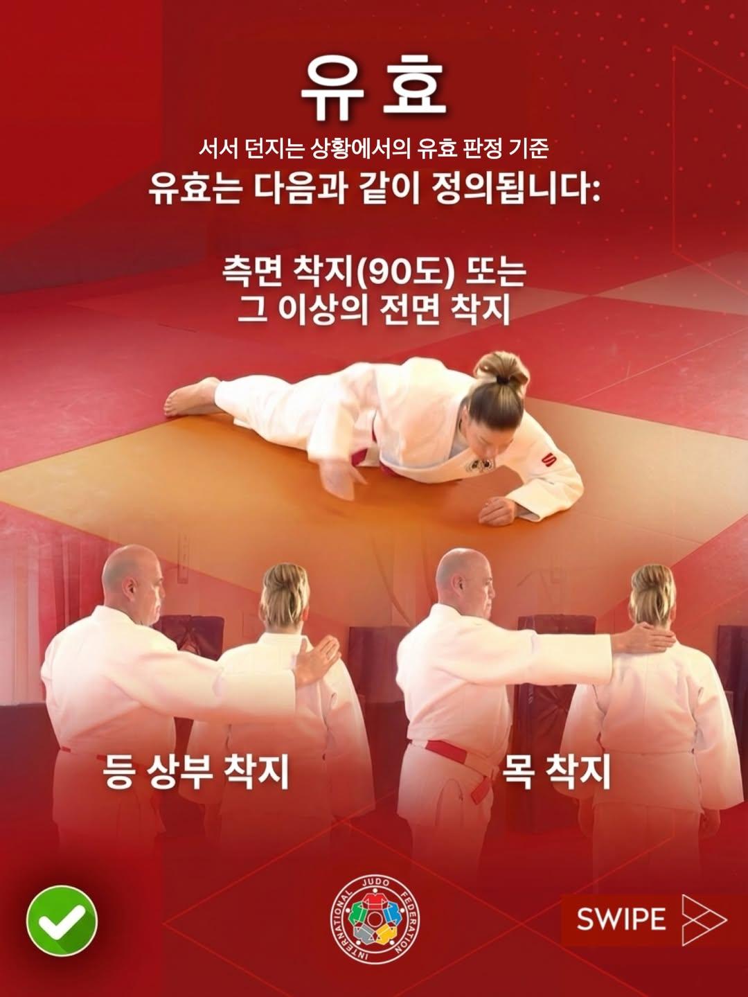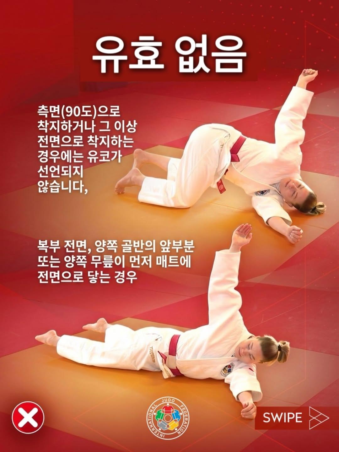 포인트: 단순히 넘어뜨리는 것을 넘어, 상대의 등을 얼마나 정확하게 매트에 닿게 하느냐가 여전히 중요하지만, 측면 착지에 대한 세부 기준이 명확해졌습니다.