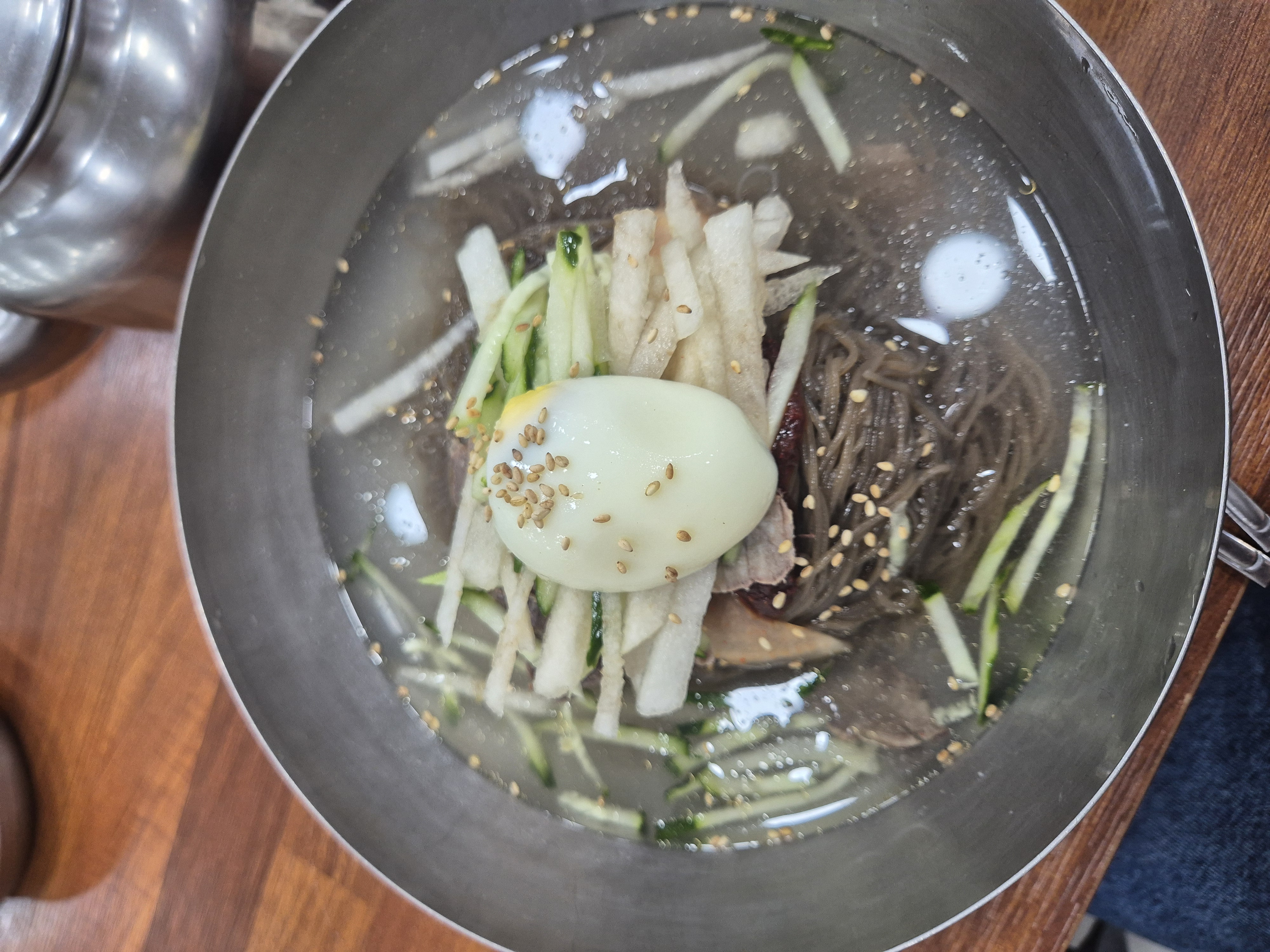 붉은 양념이 보기만 해도 군침이 돌았는데요, 매콤하지만 과하지 않고 달짝지근한 맛이 조화를 이루었습니다. 오이와 배, 삶은 달걀 반쪽이 올라가 있어 깔끔함까지 잡아주더군요.