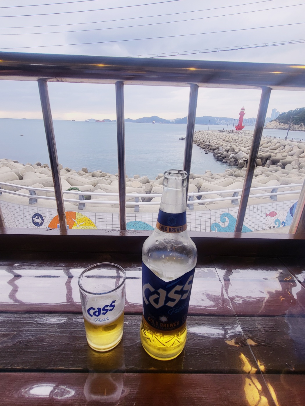 테이블 위에 놓인 차가운 맥주 한 병. 거품이 살짝 일어난 맥주잔을 들고 바다를 바라보니, 단순한 맥주가 아닌 ‘바다와 함께 마시는 술’이 되었어요. 바닷바람은 시원했고, 맥주는 그 바람만큼 청량했습니다.