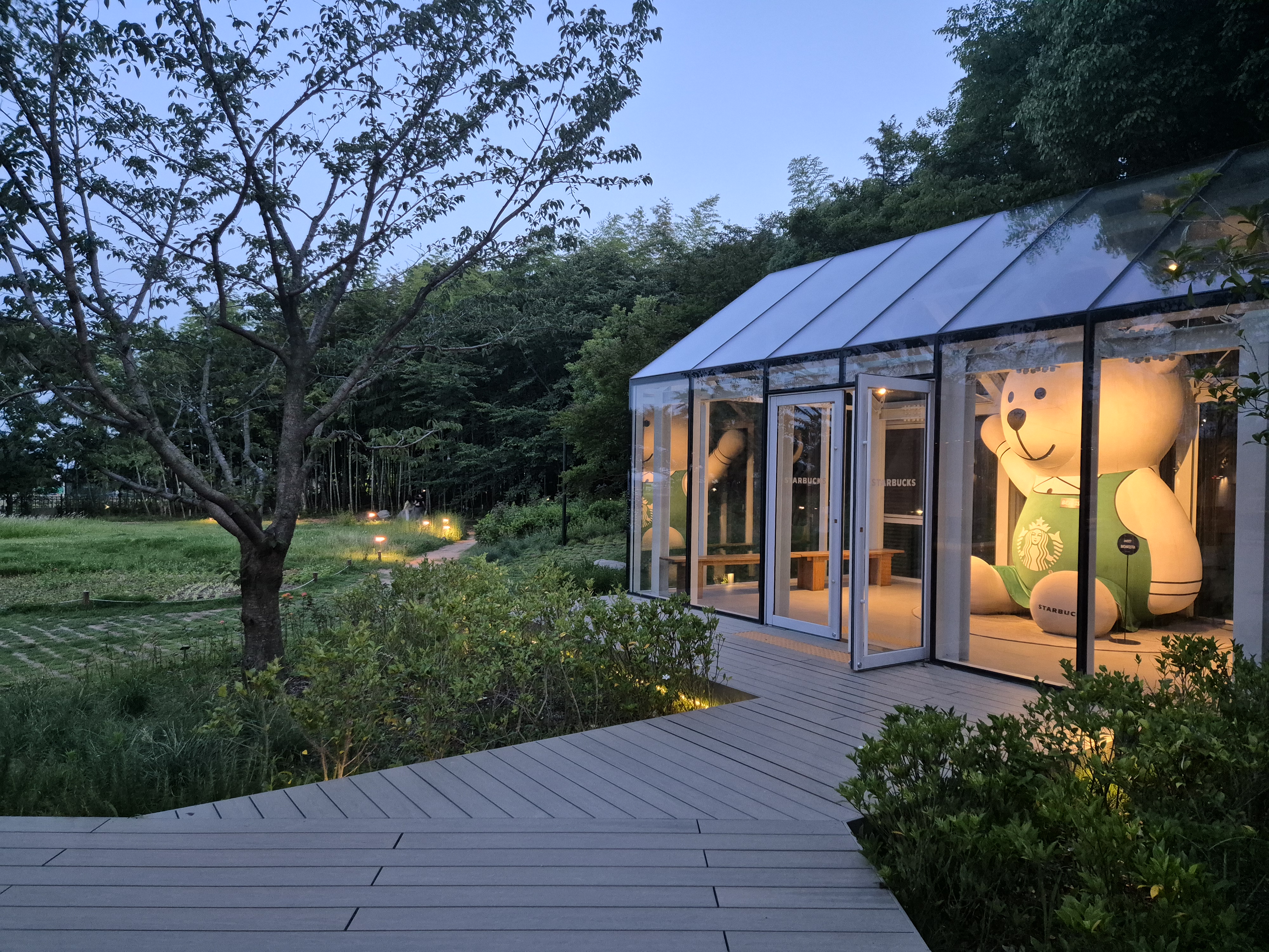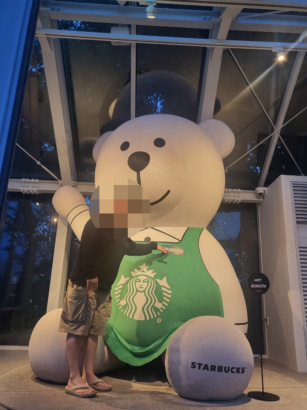 스타벅스 임랑점 매장 밖에는 커다란 곰돌이 풍선이 전시되어 있어서 그냥 지나칠 수가 없더라고요! 초록색 앞치마를 입고 있는 모습이 어찌나 귀여운지, 저절로 발길이 멈춰 섰답니다. 옆에 서서 사진을 찍으면 정말 깜찍하게 나와서, 방문 기념으로 꼭 한번 찍어보시는 걸 추천드려요! 아이들도 엄청 좋아할 것 같고, 어른들도 동심으로 돌아간 듯 즐거운 시간을 보낼 수 있을 거예요. 이 곰돌이 풍선 덕분에 스타벅스 임랑점 방문이 더욱 특별하고 재미있는 추억으로 남을 거예요 :)