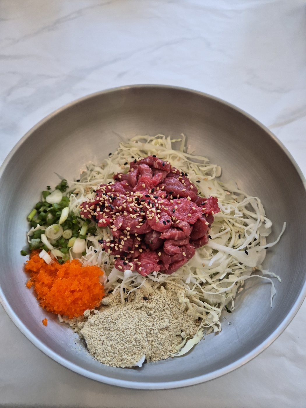 자리에 앉아 메뉴판을 보는데, 역시나 이곳의 명성처럼 다양한 메뉴가 눈에 들어왔어요. 시원한 물회부터 별미인 육회물회, 그리고 따뜻하게 속을 채워줄 전복육개장까지. 고민 끝에, 더위를 식혀줄 시원한 물회를 주문했습니다. 잠시 후, 정갈하게 차려진 한 상이 눈앞에 펼쳐졌습니다. 하얀 그릇 가득 곱게 썰린 양배추와 쫄깃한 흰 살 생선회, 그 위로 붉은 양념장과 고소한 깨가 듬뿍 뿌려진 물회는 보기만 해도 군침이 돌았어요. 젓가락으로 쓱쓱 비벼 한 입 맛보니, 새콤달콤한 양념과 신선한 회가 어우러져 힘들었던 마음이 싹 가시는 기분이었습니다.