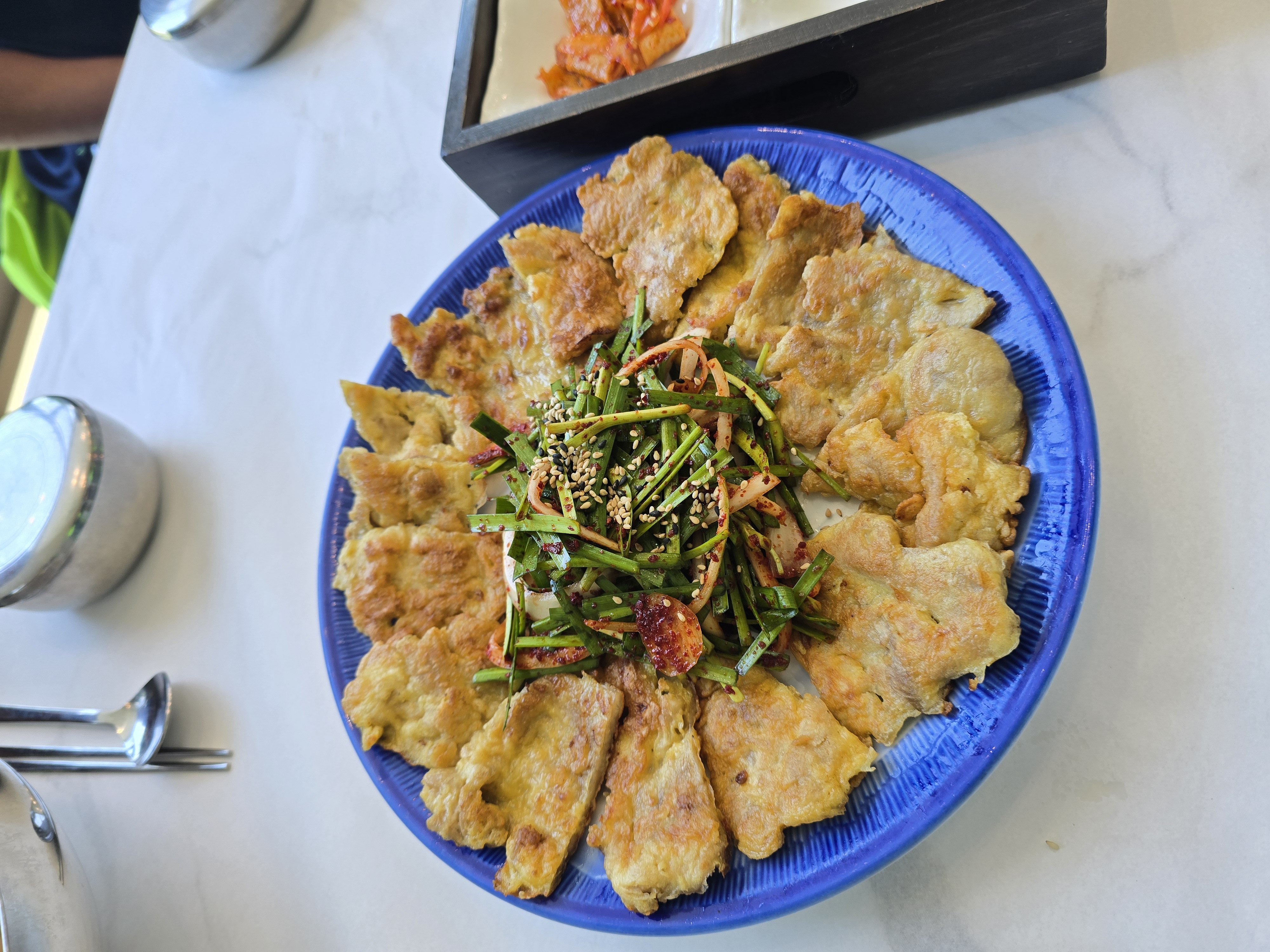 메인 메뉴만큼이나 감동적이었던 건 다채로운 밑반찬이었습니다. 특히, 노릇노릇하게 구워진 육전은 이 집의 숨은 주인공이라고 해도 과언이 아니었죠. 부드러운 고기 속살과 바삭한 겉면이 조화로워 자꾸만 손이 갔습니다. 함께 나온 부추무침을 올려 먹으니 매콤함이 더해져 물회와 환상의 궁합을 자랑했습니다. 제가 시원한 물회를 먹는 동안, 함께 간 동료가 주문한 전복육개장도 눈길을 사로잡았습니다. 따뜻한 그릇에 담겨 나온 전복육개장에는 신선한 전복 한 마리가 통째로 들어가 있었고, 깊고 칼칼한 국물 맛이 일품이었죠. 시원한 물회로 입맛을 돋우고, 얼큰하고 든든한 전복육개장으로 속을 채우니 비로소 완벽한 한 끼가 완성되는 느낌이었습니다.