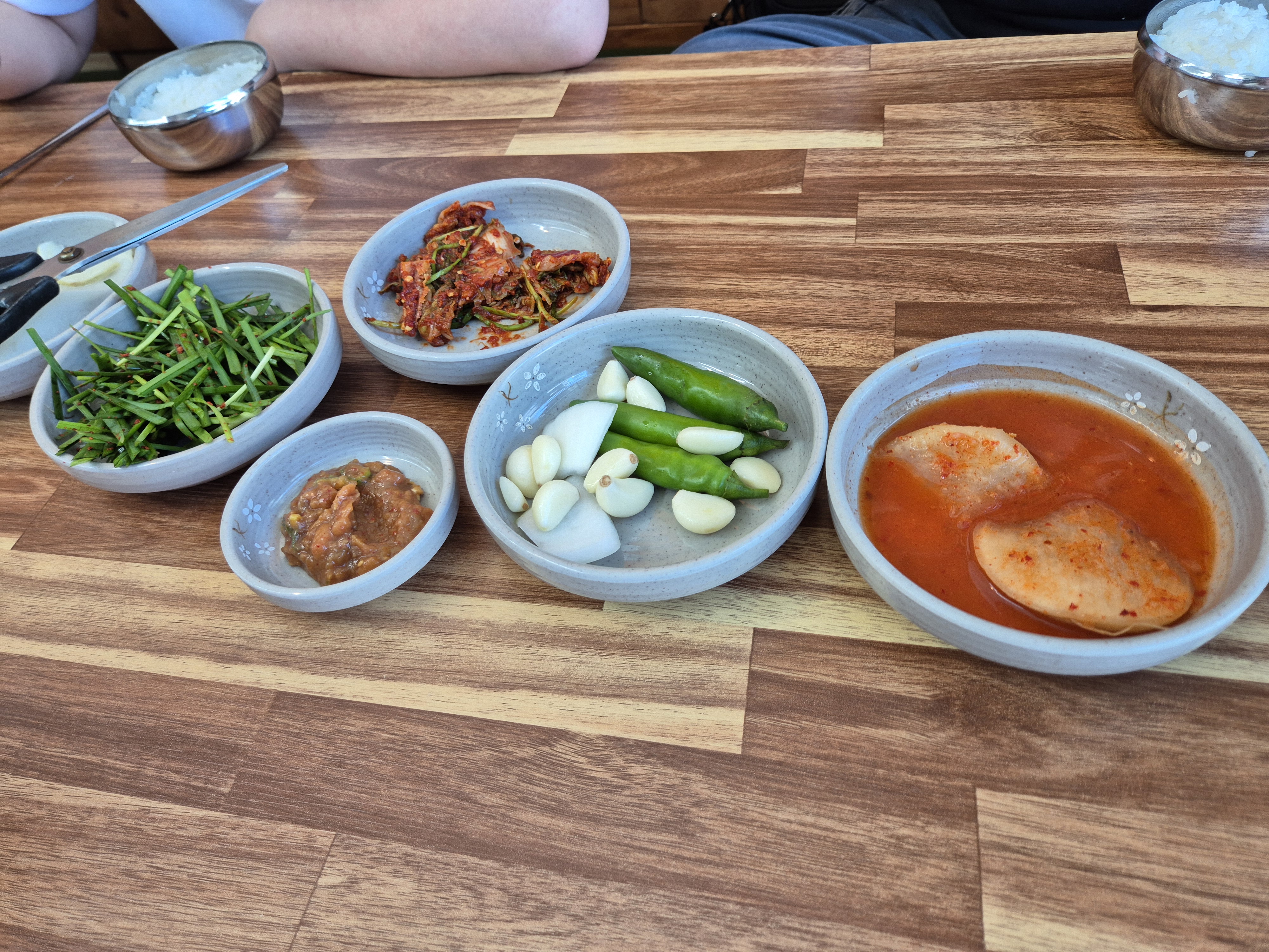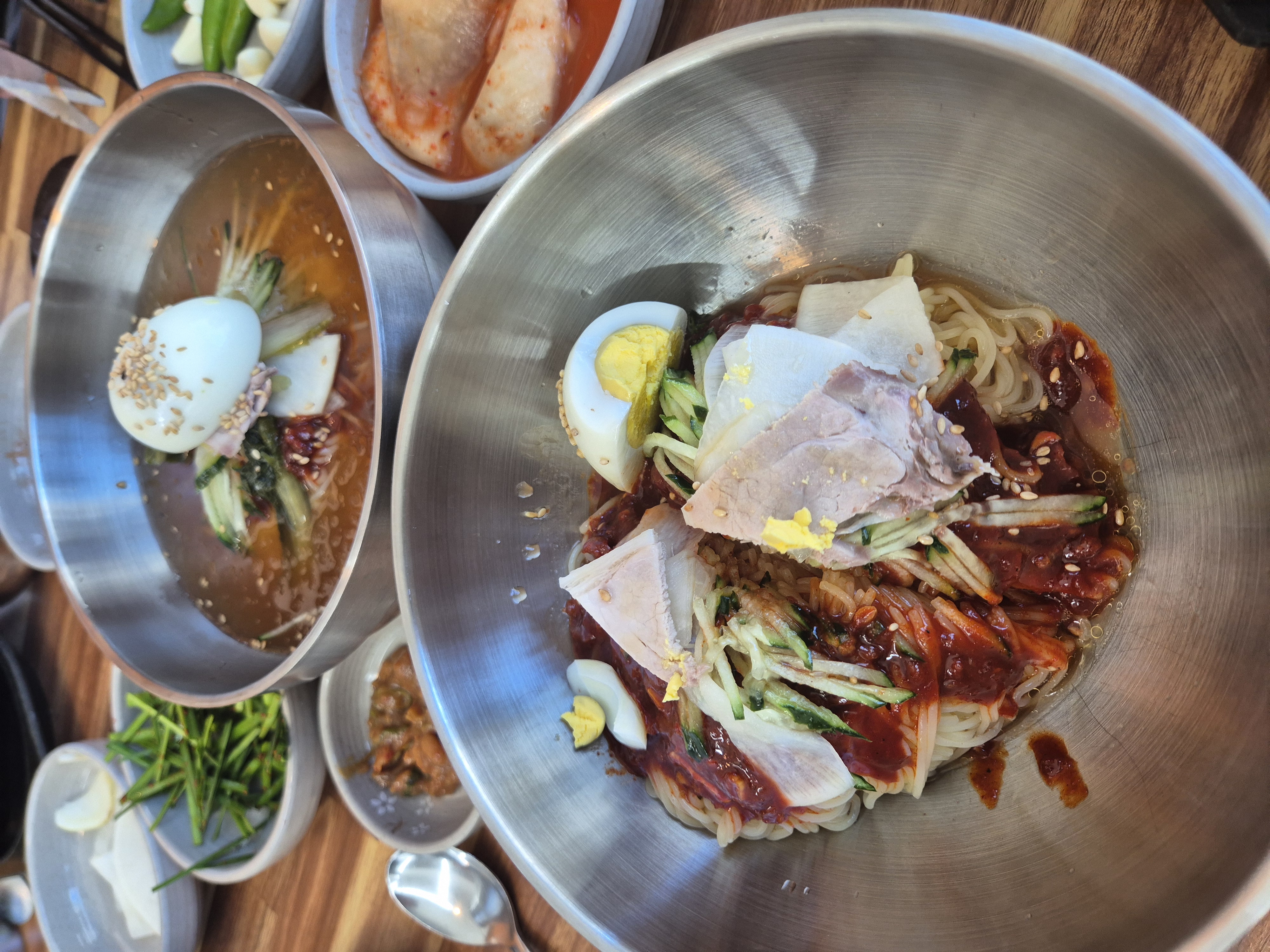 주문 후 얼마 지나지 않아 따끈한 국밥과 시원한 밀면, 그리고 정갈한 밑반찬이 상에 올랐습니다. 뽀얀 국물 위로 푸짐하게 올라간 돼지고기와 부추 등 재료들이 먹음직스러운 비주얼을 자랑하는 섞어국밥부터 눈에 들어왔습니다. 부추는 기본으로 제공되며, 저는 국밥이 나오자마자 신선한 부추를 듬뿍 넣어주었습니다. 함께 나온 밑반찬으로는 아삭한 깍두기, 시원한 겉절이 배추김치 그리고 국밥에 빠질 수 없는 새우젓과 다대기가 제공되었습니다.