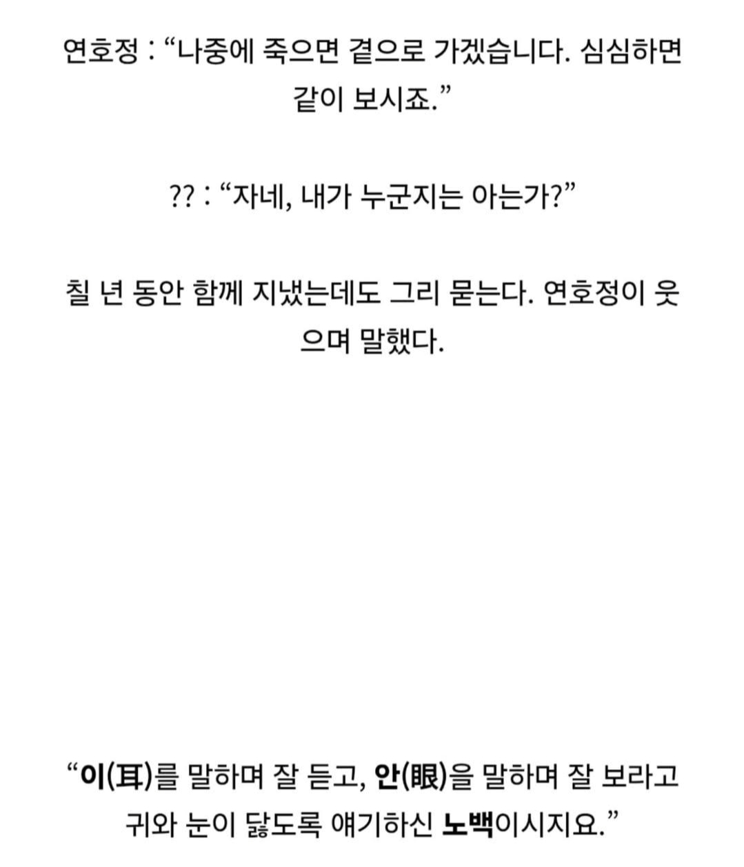 “이야기 보고 듣는 게 내 낙인데, 자네가 죽어도 난 언제까지나 세상을 보고 있을 걸세.”