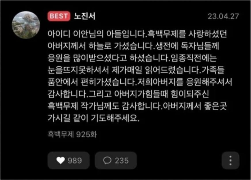 “아이디 이안 님의 아들입니다. 아버지께서 하늘로 가셨습니다. 생전에 흑백무제를 보며 큰 힘을 얻으셨습니다. 응원해 주신 독자님들, 그리고 끝까지 힘이 되어주신 작가님께 감사드립니다. 아버지가 좋은 곳으로 가시길 기도해 주세요.”
