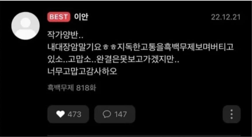 “작가 양반.. 내 대장암 말기요ㅎㅎ 지독한 고통을 흑백무제 보며 버티고 있소. 고맙소.. 완결은 못 보고 가겠지만.. 너무 고맙고 감사하오.”