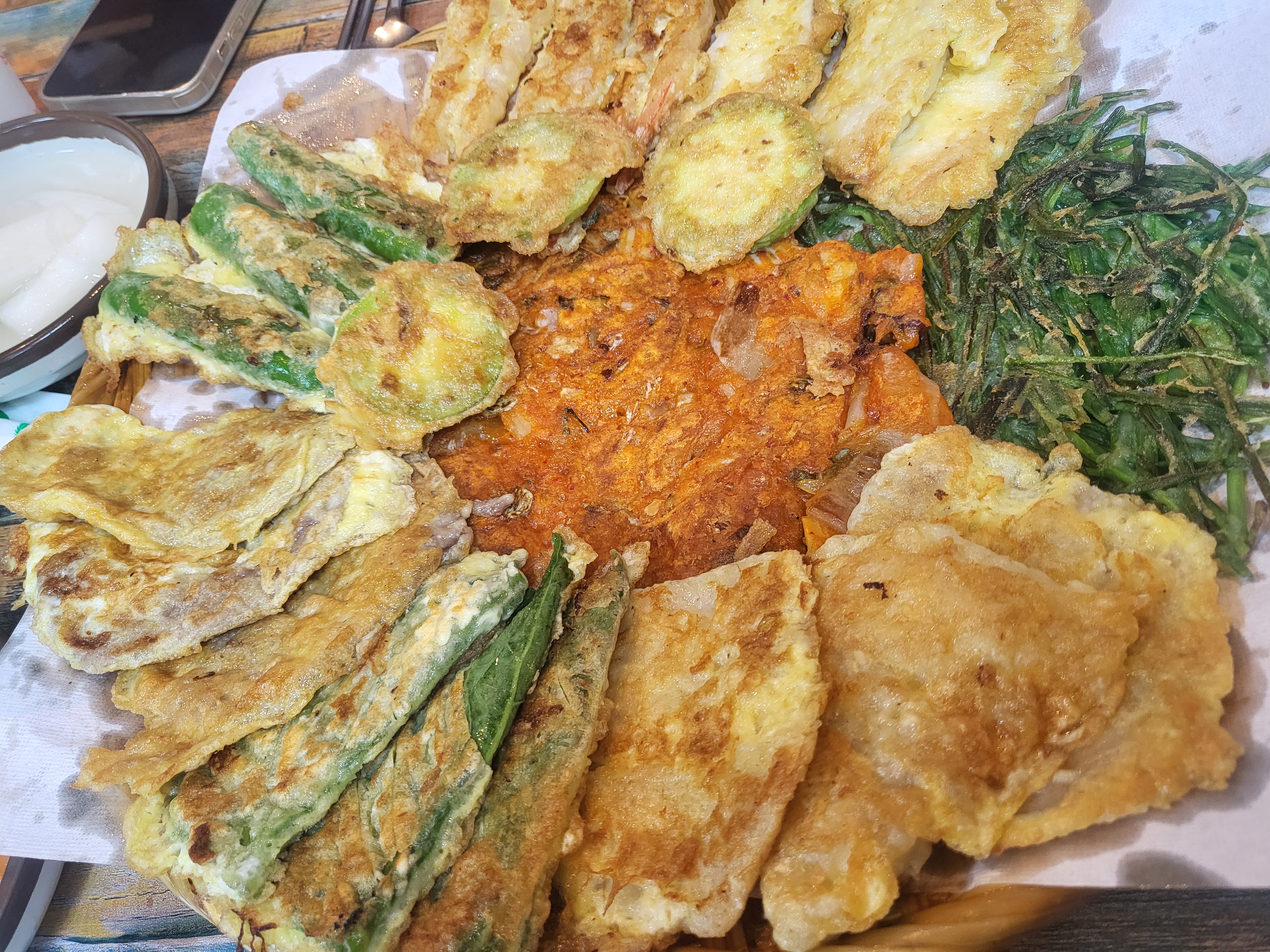 홍어삼합을 맛보고 있는 사이, 지글지글 전을 부치는 소리가 들려왔습니다. 고소한 기름 냄새가 가게 안을 가득 채우며, 드디어 모둠전 한 접시가 나왔어요. 갓 부쳐낸 전들은 김이 모락모락 피어오르며 따뜻했습니다.