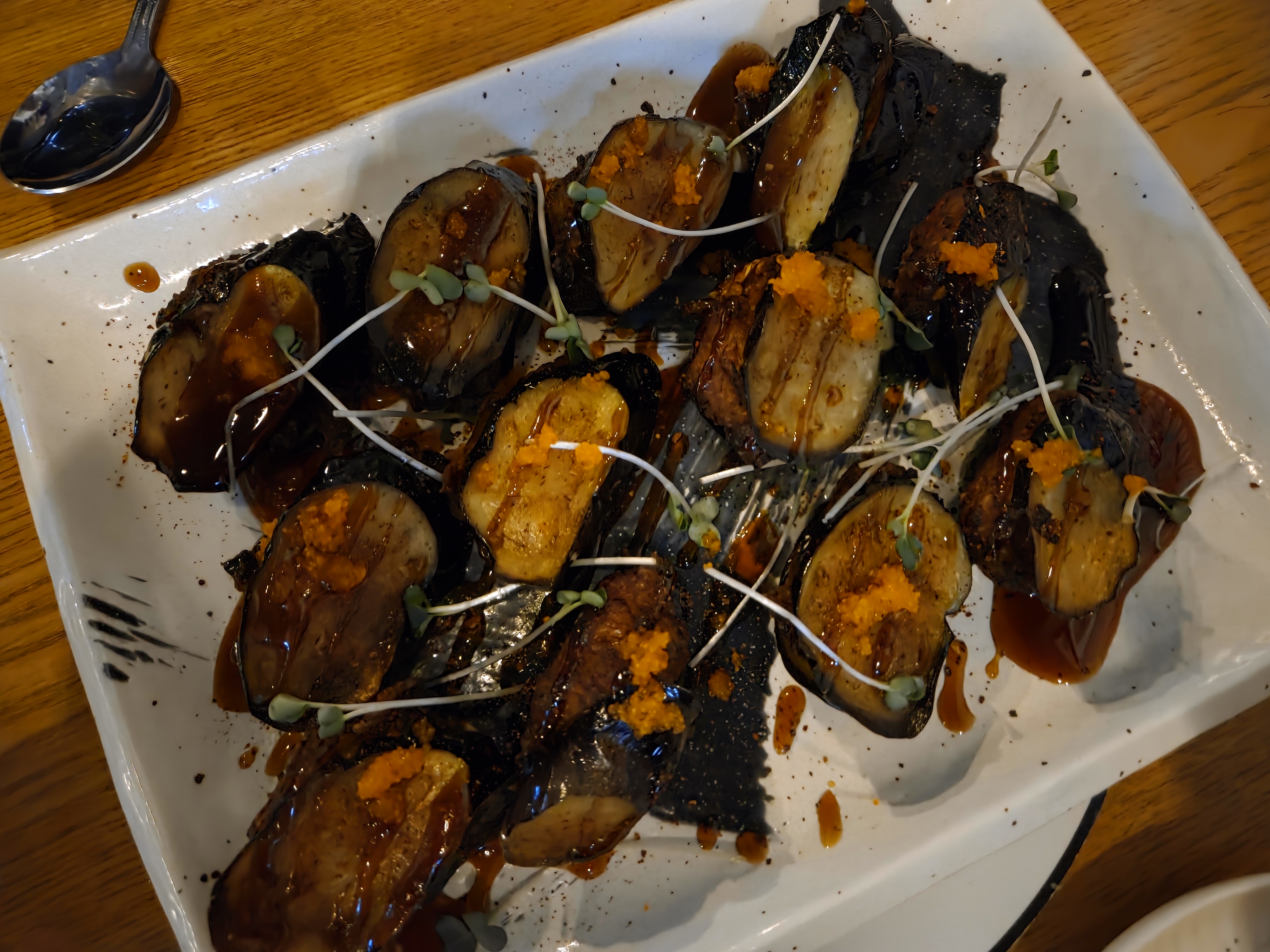 두툼하게 구운 가지 위에 달콤 짭짤한 된장 소스를 바르고, 날치알과 새싹을 얹어 비주얼도 예쁘더라고요. 가지가 부드럽게 녹는 식감에 된장의 감칠맛이 더해져 술안주로도 좋고, 반찬처럼 집어먹기에도 괜찮았습니다.